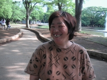 | 「あたらしい仕事」 M)みっちゃん、今日は、すごく暑いね〜! K)暑いよー!もう、汗が出て大変だよ。 そうそう、私、この間から勤めてんだよー。 今日も、朝、仕事して帰ってきたんだよ。 働きに出てます、私! M)え?だって、みっちゃん、空き缶の仕事してたじゃん。 別の仕事見つかったの? K)そう、空き缶は、この間でやめちゃったから、 今は働きに出てんのよ。 土日以外は、毎日仕事行ってますよ。 M)へえ、すごいすごい!おめでとう! 今度はどんなお仕事? K)うどん屋さんだよ。ある人の紹介で。 掃除やったり、洗い物やったり、テーブル拭いたり、 色々やってます。 あれやってください、これやってください、洗って下さいって 大変なこともあるけど、我慢してるよ。 1日3時間の時もあるし、5時間の時もあるけど、 行ってるから! M)仕事はどうですか?楽しい? K)今?忙しいですよ。忙しい! でも楽しい・・悪い時もあるし、嫌なときもあるしさあ。 M)空き缶やってた時と、どっちがいい? K)私、今のほうがいいよ。 だって、空き缶は、私は月に1回しかやってなかったから。 今は、毎日行かせてもらってるから。 仕事は、空き缶より今の方が楽。 M)空き缶やってた時って、どのくらい稼いでたの? K)私は、1ヶ月に1回出すから、2万くらい。 今は、毎日だから楽しいよ。大変なこともあるけどね。 M)お給料は、前よりいいの?みっちゃん、お金は貯めてるの? K)2万8000円になったよ。まだもらってないけど。 お金は、あんまり他人に貸しちゃダメよ。返ってこないから。 M)うん、そうだよね・・。仕事は、毎日行ってるんだよね? K)そう、時間は短いけど、毎日行ってる。 今のところは、がんばってるよ。うん、がんばってます。 「みっちゃんの本名」 M)ところで、みっちゃんって、ミチコさんっていう名前なの? K)ちがうよ。本当はね、「○子」っていうの。 「○○○○ ○子」です。 M)えーーっ!!!「○子」?!! びっくり! じゃあ、なんでみんな「みっちゃん」って呼んでるの? K)知らない。分からないです! 誰かが勝手に呼び始めて、皆、呼んでるんでしょ? M)そうなんだあ。いやあ、びっくりしちゃった。 (「知ってました?」と長年みっちゃんをよく知る人に聞いてみた のですが、その人も知らなかったです・・) K)いいよ、「みっちゃん」で。多分、誰も知らない。 聞かれない。 M)みっちゃんは、野宿の仲間で、仲のいい人っているの? K)あんまり、いないね。うん、いない。いないです。 M)でも、みんな 「みっちゃん、みっちゃん」って 話しかけてるよね。 それでも仲良くないの? K)仲はよくないです。 「ホームレスになる前」 M)みっちゃんは、野宿する前は、何をしていたの? K)働いてたよ。パン屋さんで。サンドイッチとか売ってるパン屋さん。 5年も働いてたよ。 M)どうして辞めたの? K)分からない。分からないよ。私は分からない。 M)みっちゃんは辞めたくなかった? K)うん、そう。辞めたくなかったけど、分からない。 もう忘れちゃったから。 |